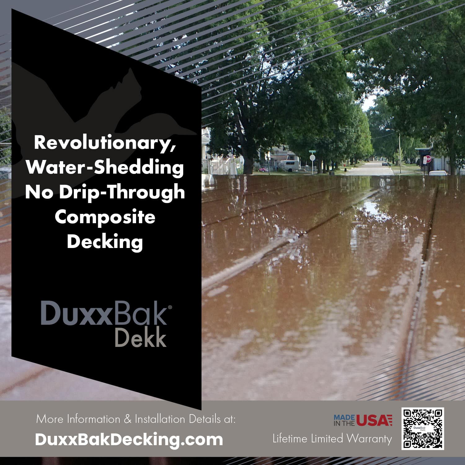 Are you tired of water damage on your house or under your deck? Are you looking for a water tight, water proof, dry under deck system? DuxxBak™ (pronounced like “Ducksback”) is the only complete non-vinyl composite water shedding deck system available. DuxxBak’s patented formulation is, in part, what makes it a step above the competition. With a combination of Biodac®, rice hulls, high-density polyethylene resins, and other high-quality ingredients, DuxxBak™ has high fade resistance and very minimal water absorption in comparison to its wood composite competitors.